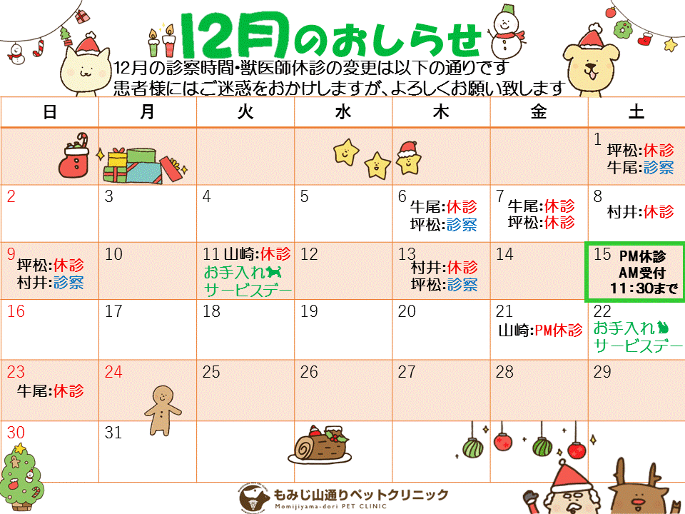 12月1日(日)~獣医師 井口の診療日に変更がございます