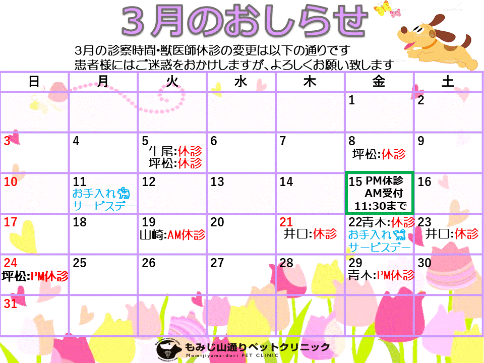 獣医師 坪松の診察日が変更となりますので出勤表をご覧ください。
