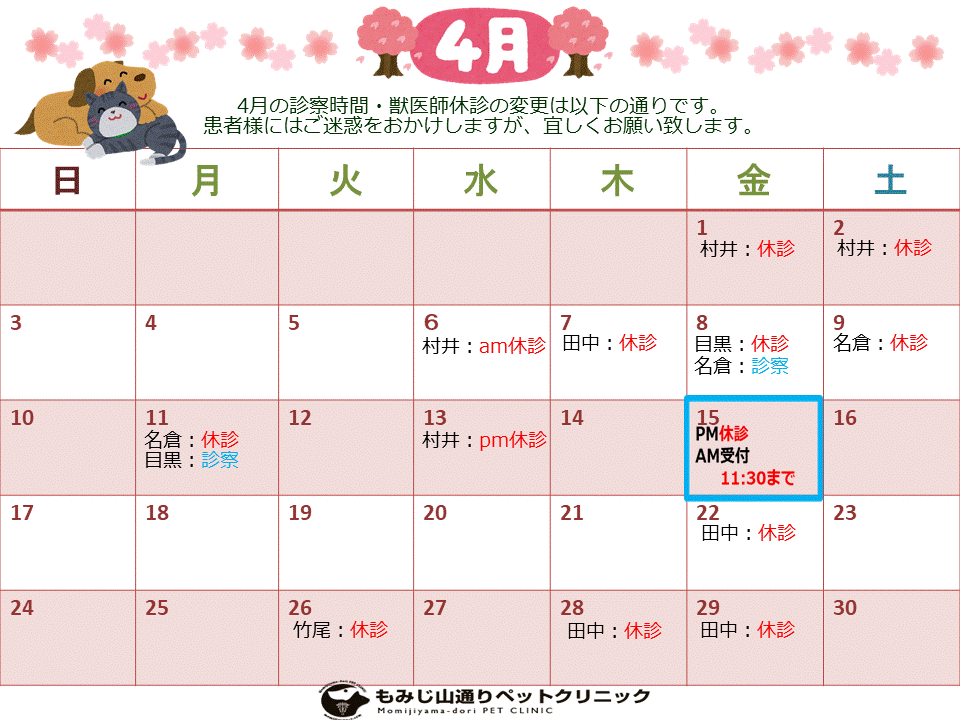 4月の獣医師出勤予定表です。ご確認ください。