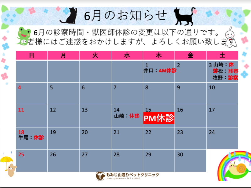 6月の獣医師出勤予定表です。ご確認ください。