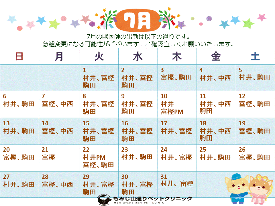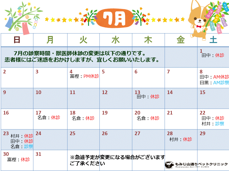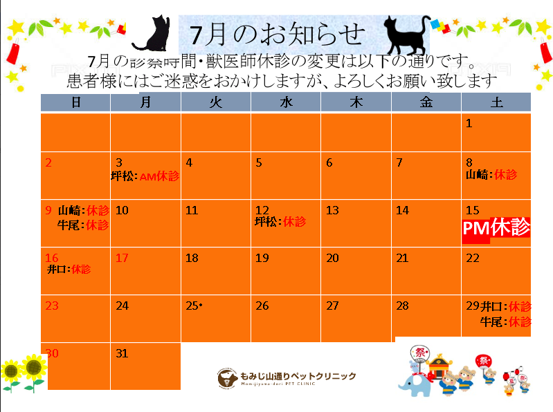7月の獣医師の休診・病院休診のお知らせです