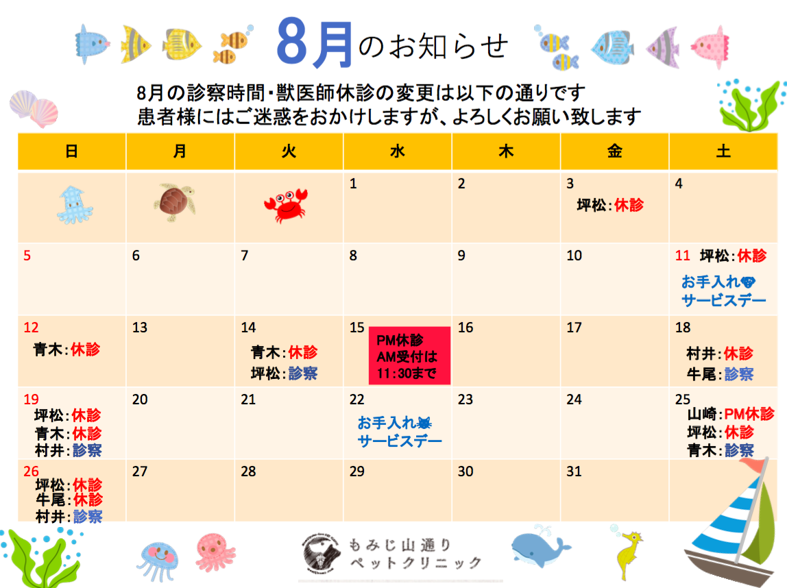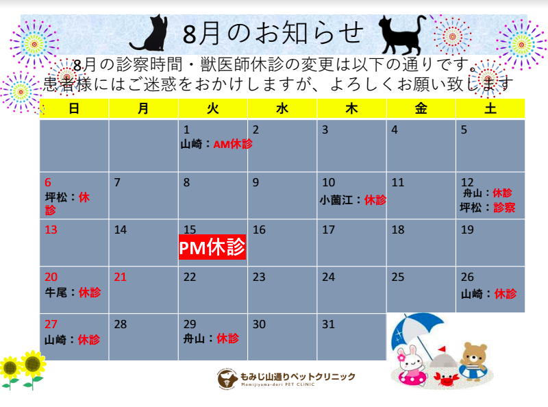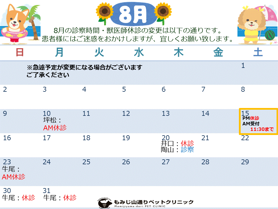8月の獣医師の診察日の変更は以下の通りです。
