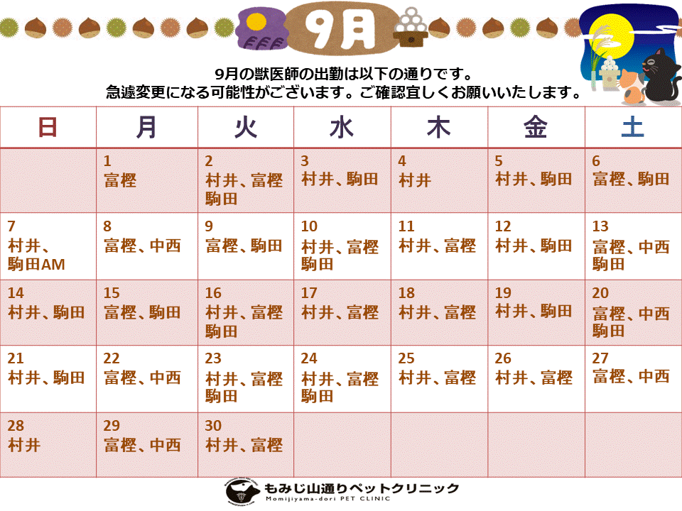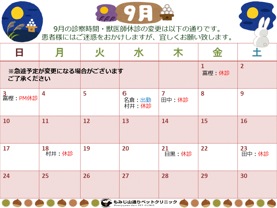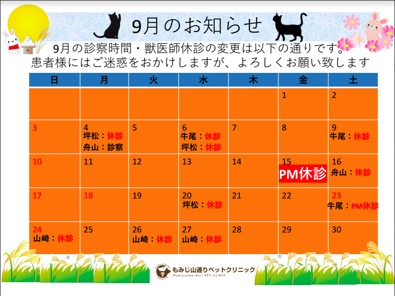 9月の獣医師の休診・病院休診のお知らせは以下の通りです。