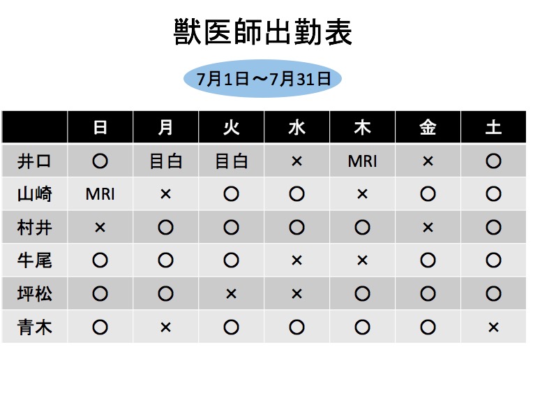 7月より獣医師の出勤日に変更がございます。また8月にも変更が入る予定です。