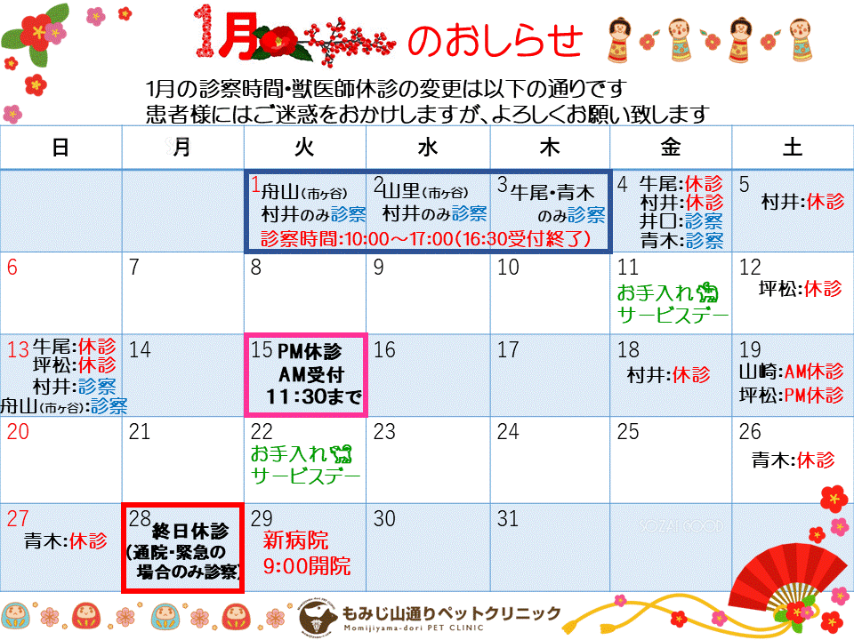 1月4日(金)より獣医師の診察に変更があります。