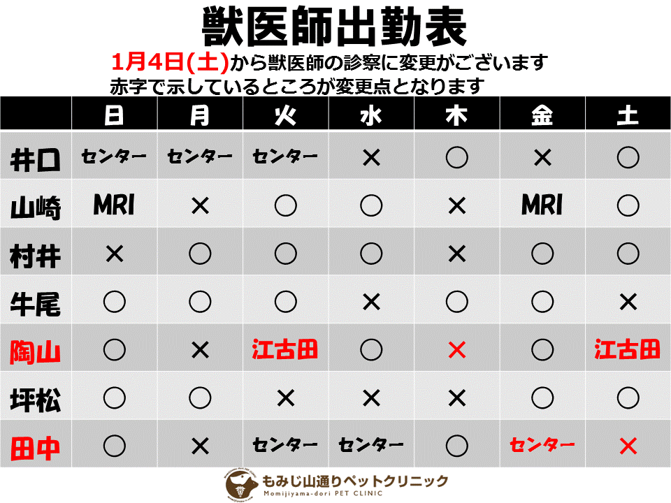 1月4日(土)から獣医師の診察に変更がございます
