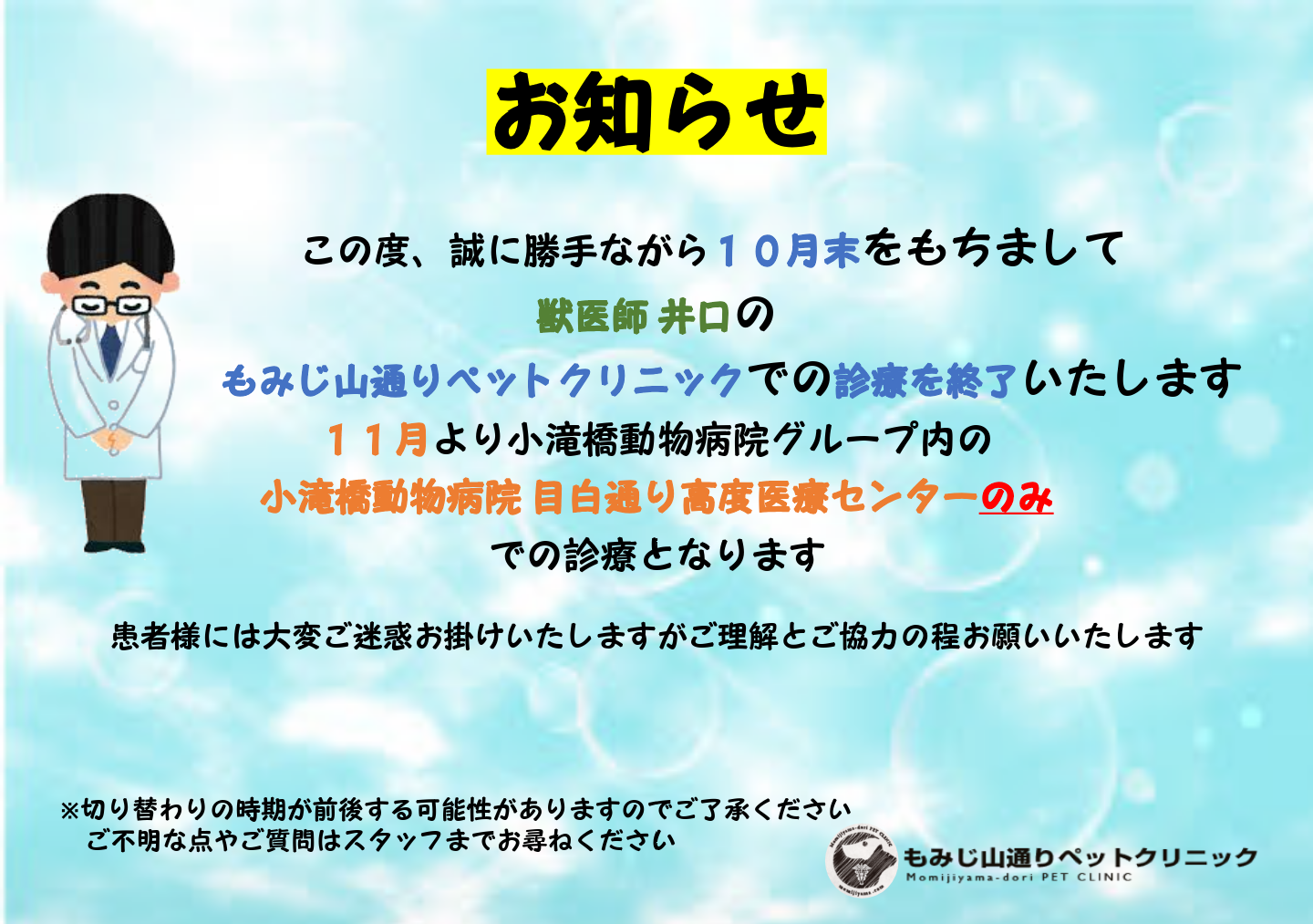10月5日から獣医師のシフトが変わります。