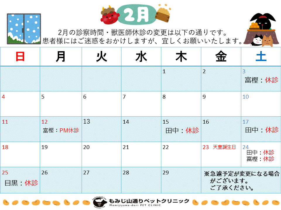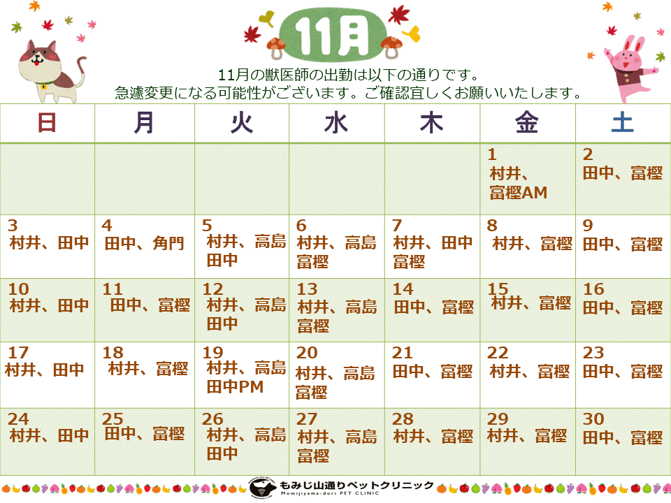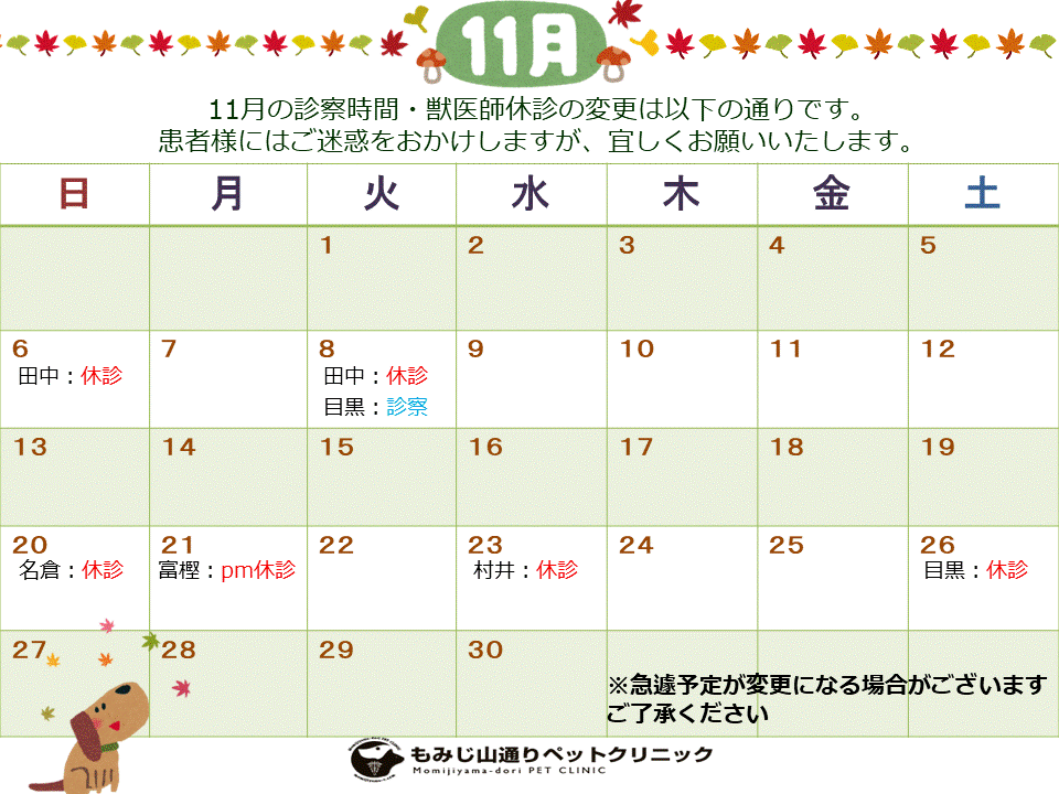 獣医師のシフト変更もありますので、出勤表をご確認ください。