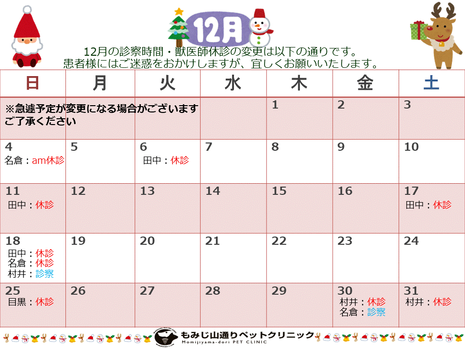 12/26(木)は診療獣医師の時間変更・休診があります。