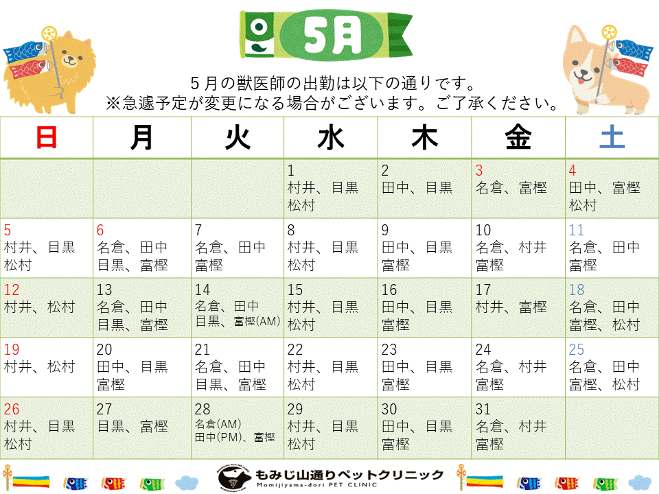 5月より獣医師 坪松の診療日が変更になりますのでそちらもご確認ください。