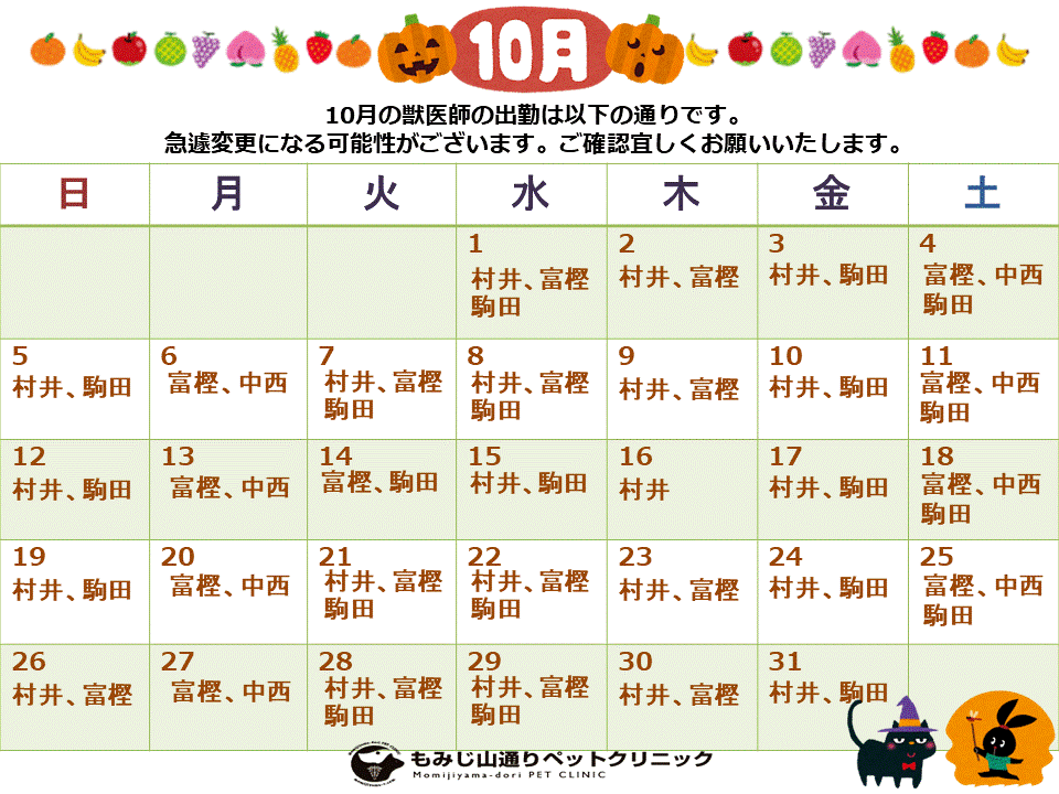 10月の獣医師の休診・病院休診のお知らせは以下の通りです。