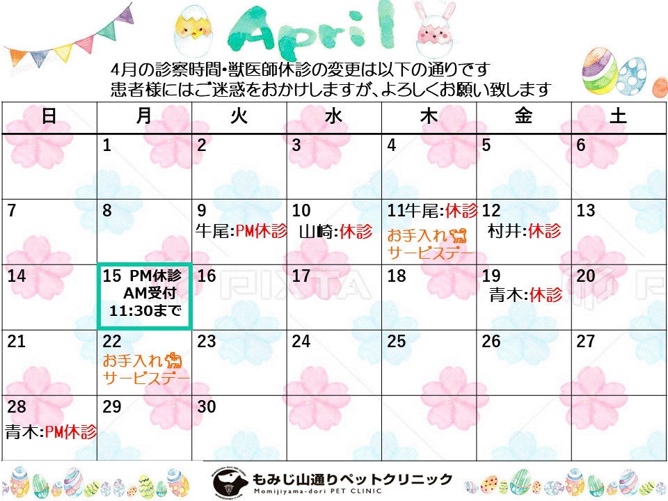 4月の獣医師出勤予定表です。ご確認ください。